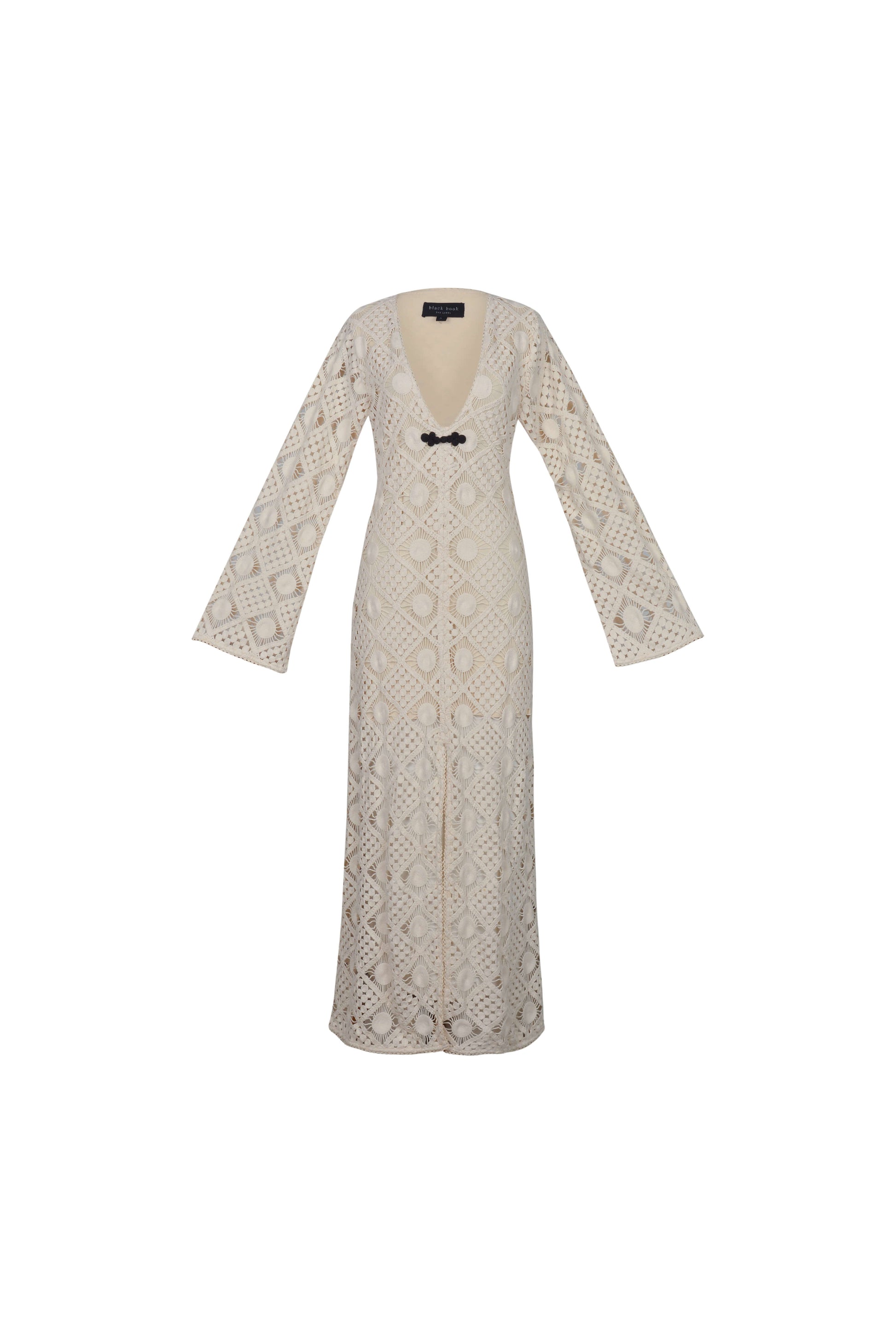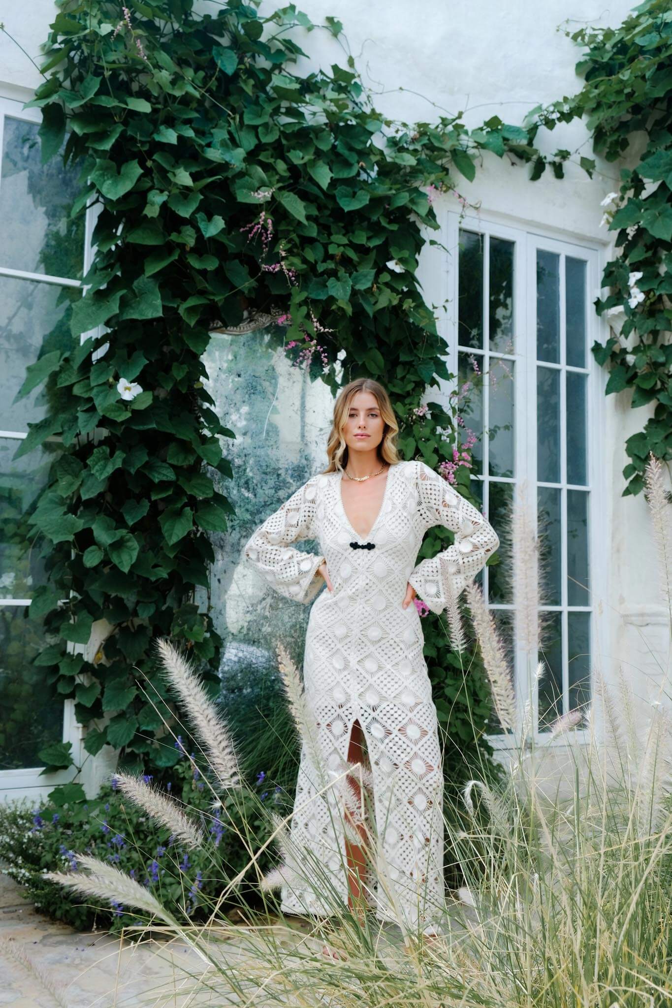 El vestido largo Soleil irradia elegancia bohemia con su delicado encaje de algodón. Su tono blanco roto le aporta un toque de sofisticación atemporal, mientras que las mangas acampanadas y el pronunciado escote en V realzan su elegante silueta. Perfecto para un look veraniego elegante y relajado. El encaje de algodón le aporta transpirabilidad y comodidad.