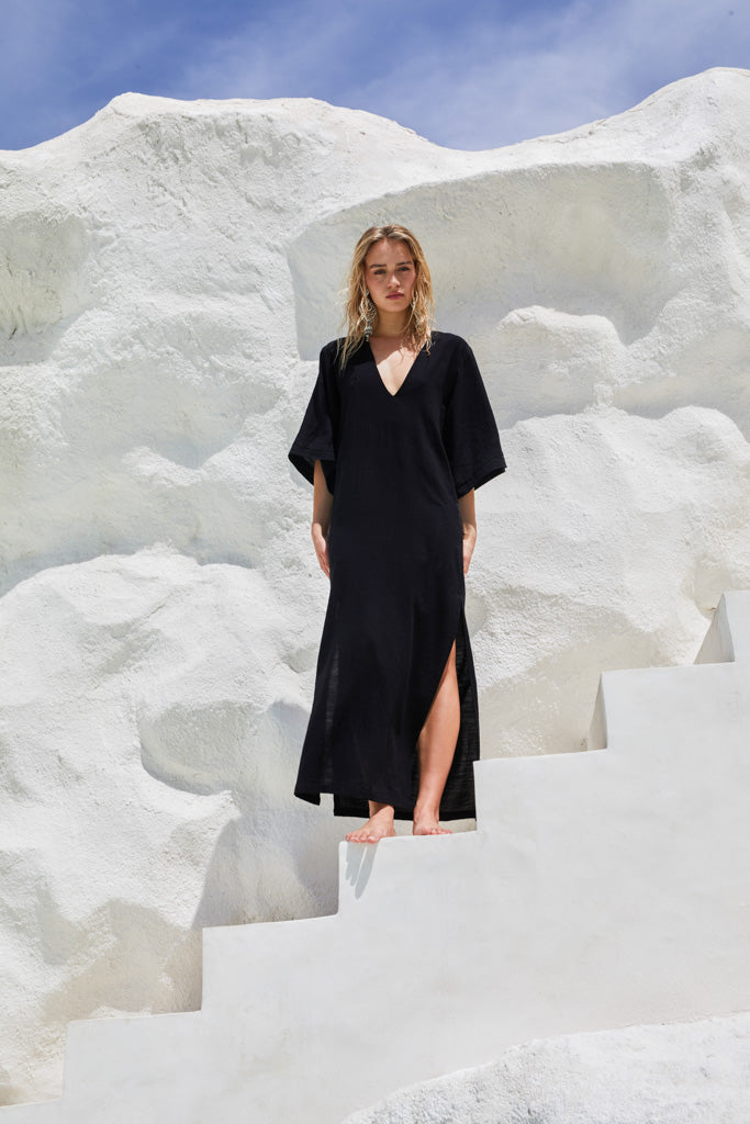 The Isidora Kaftan is a rhapsody of cool sophistication with a relaxed silhouette that floats effortless over the body. A deep V neckline adds a touch of spice, while the wide sleeves make for a bold statement. Your perfect summer companion.