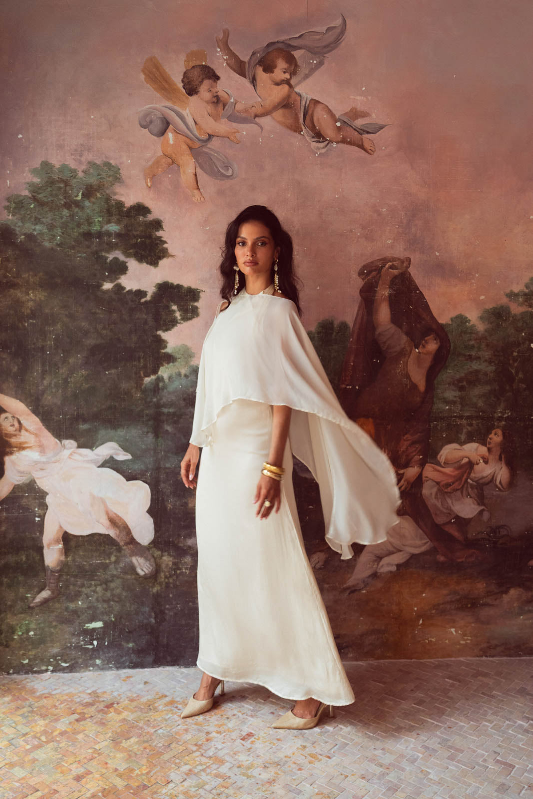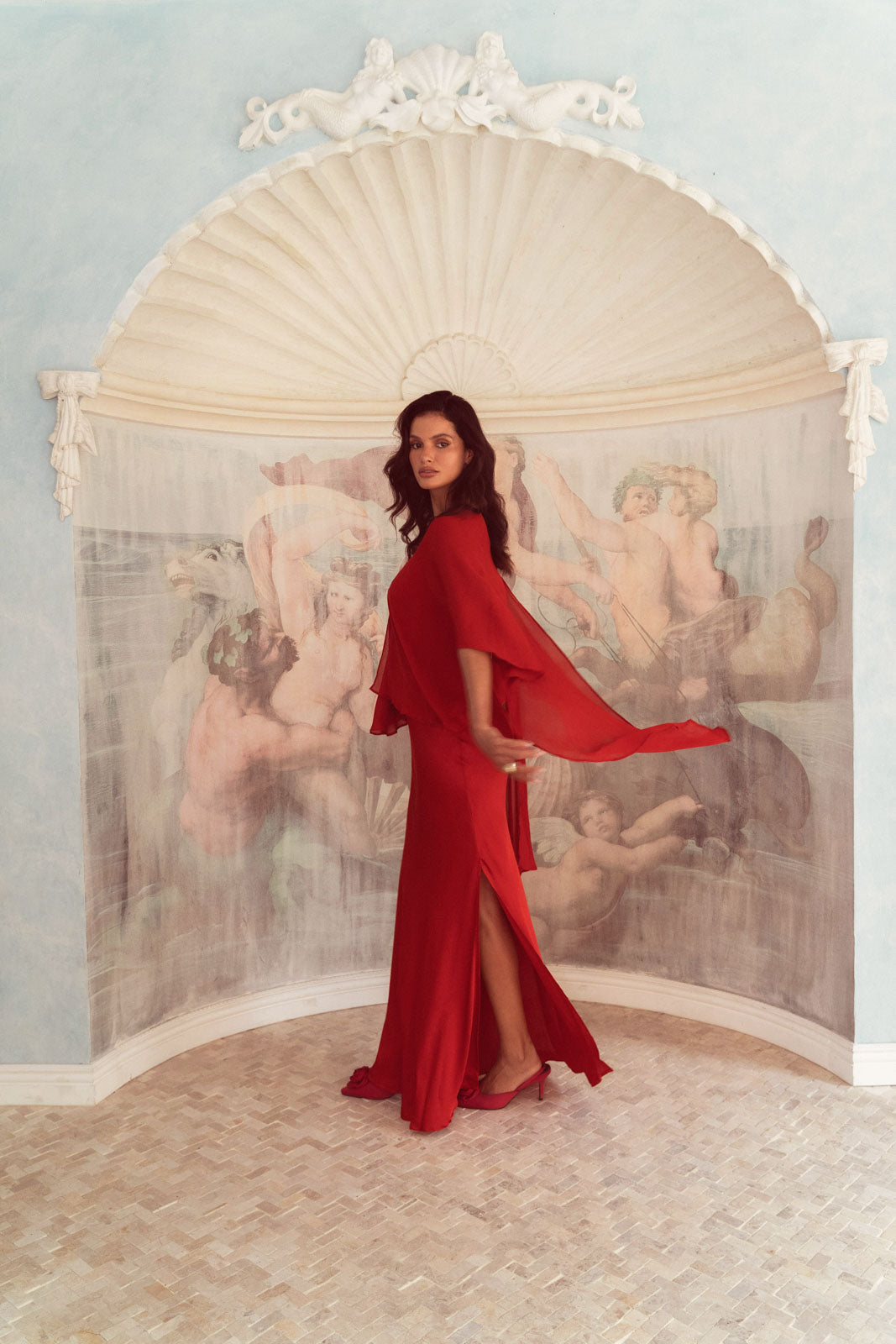 The Sienna Cover up Shawl is a versatile piece that can be worn in different positions, Made of luxurious viscose crepe, this is the perfect cover up for your evening outfit.