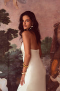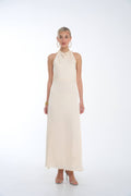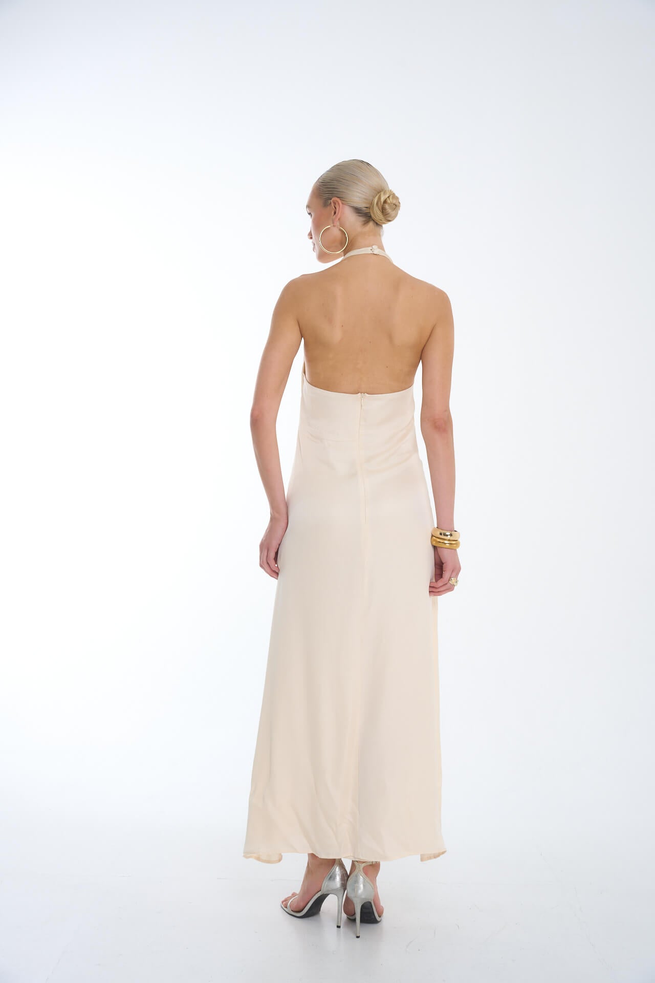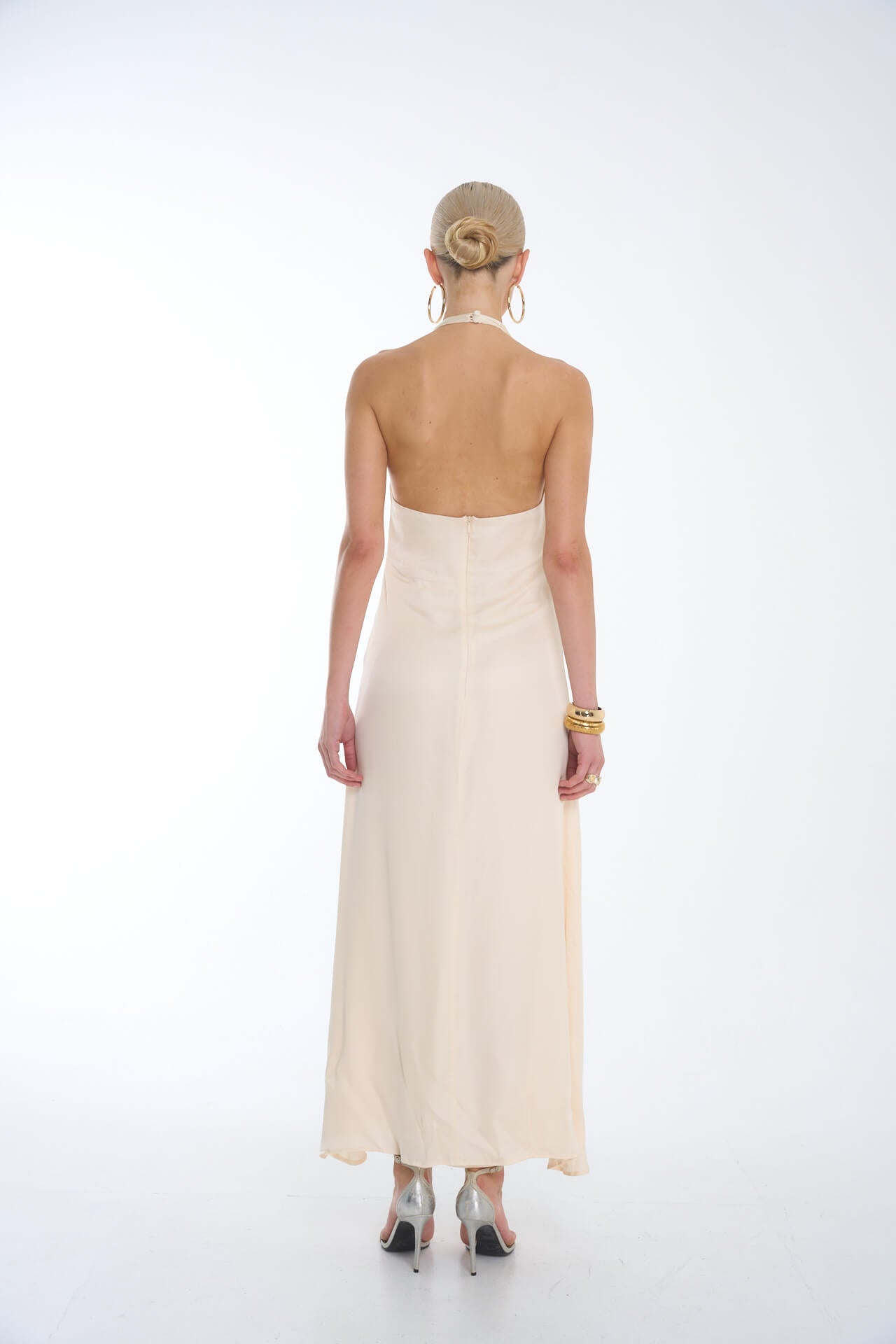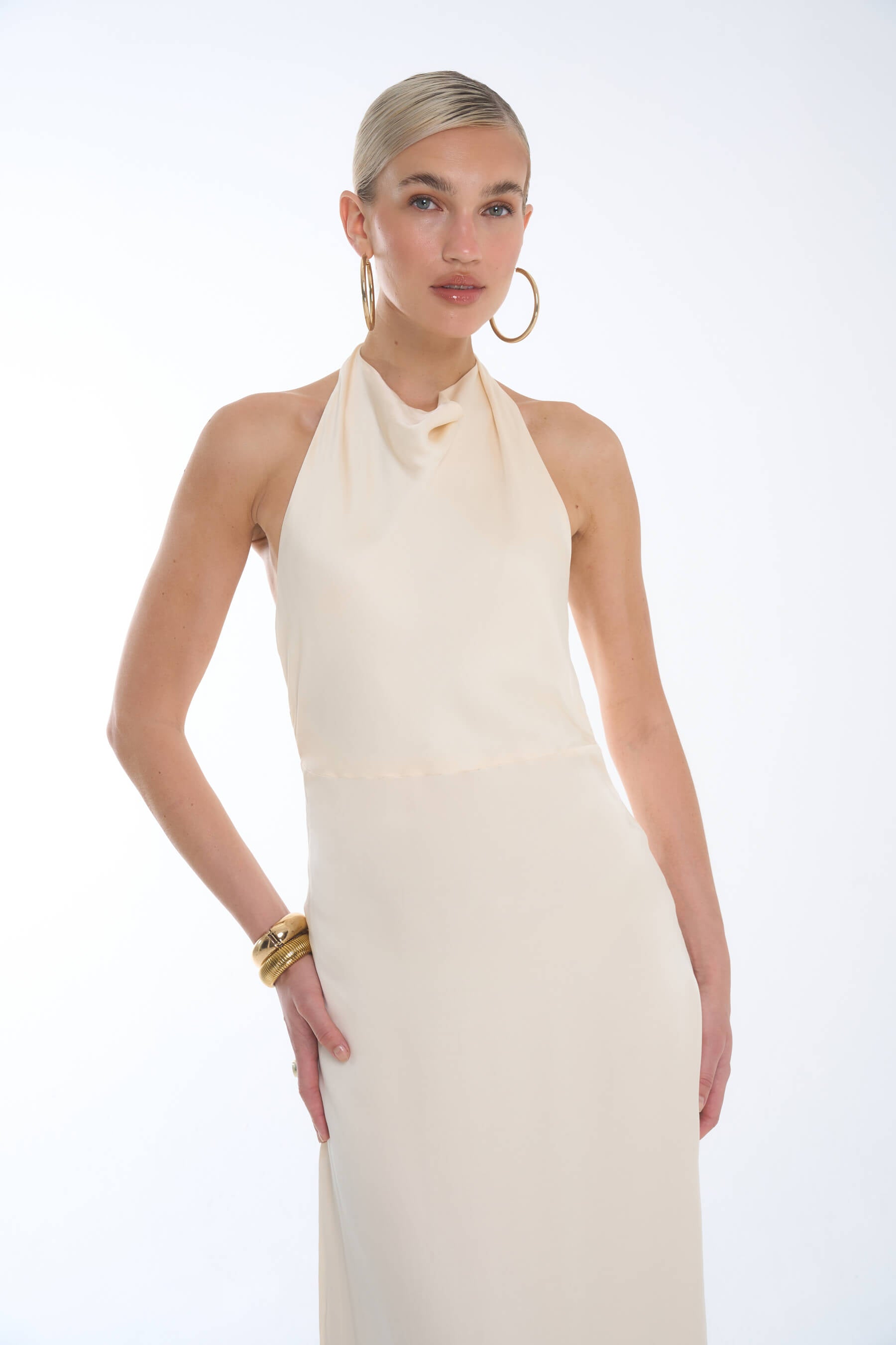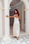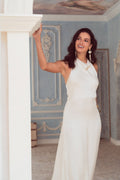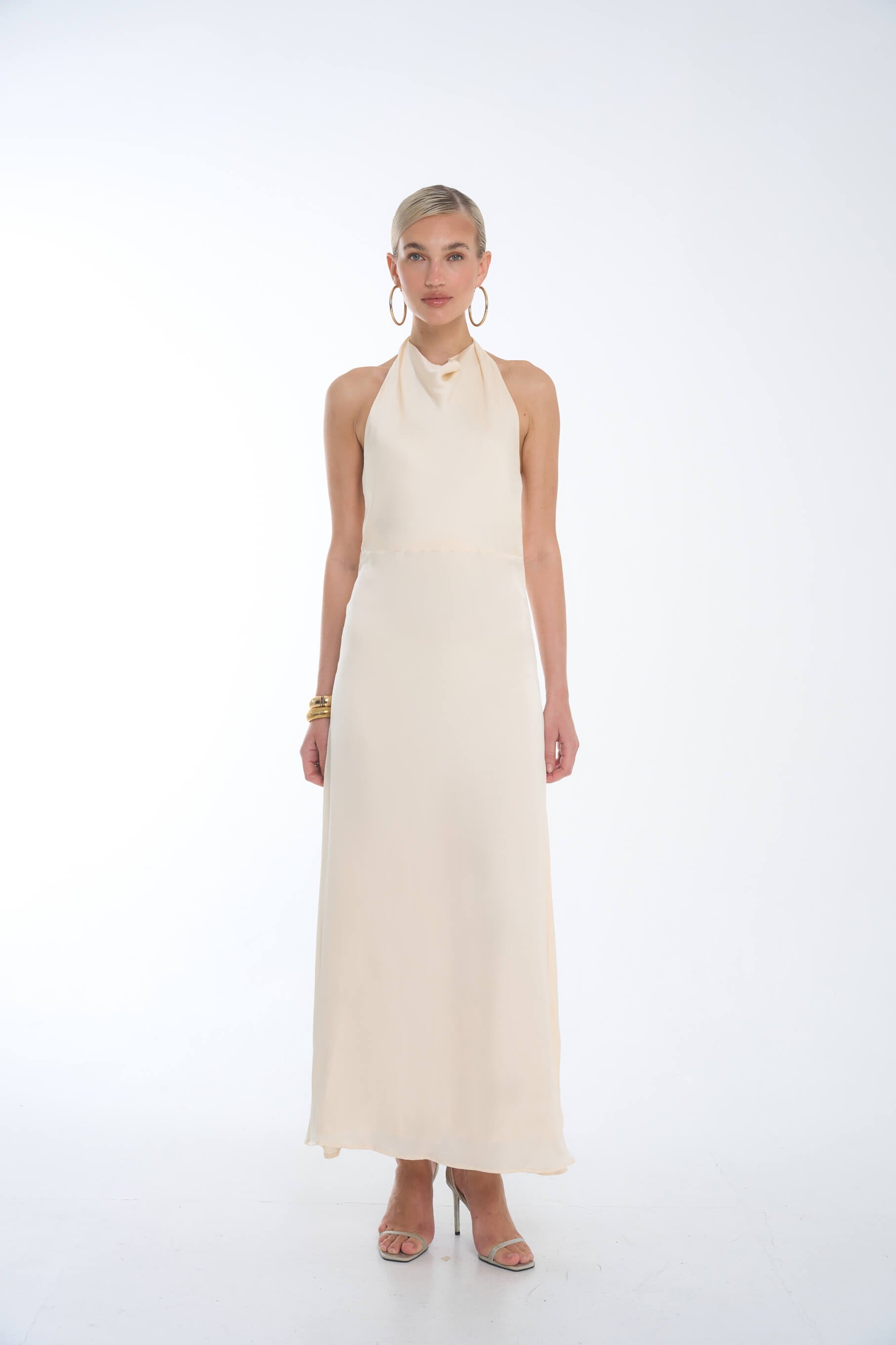 The Tasia Long Dress is a timeless and versatile piece, perfect as an ivory wedding dress or a stunning blue option for wedding guests. Made from 100% viscose satin and fully lined for comfort, it features a delicate small cowl neckline, a cinched waist, and a flowing A-line skirt that drapes gracefully with every step. Designed in Spain and handmade in Bali, it blends elegant design with artisanal craftsmanship.